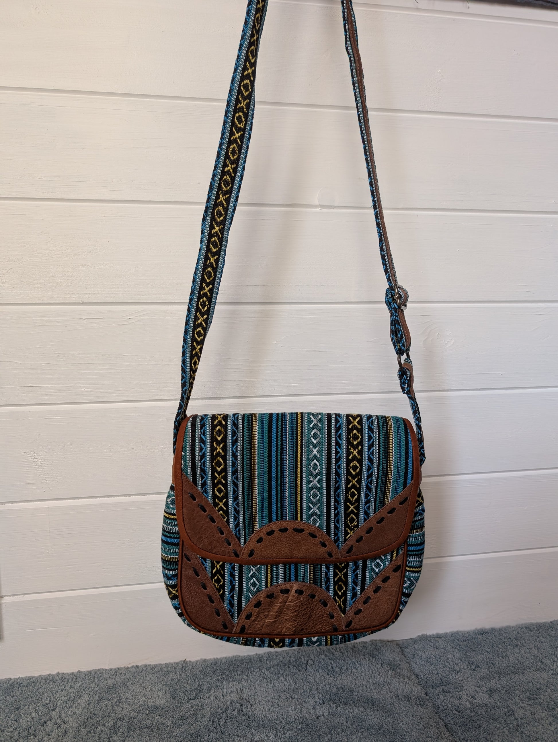 Perfect for a bit more space in your handbag ,this gheri Cotton and leather trim handbag has a beautiful leather stitch finish.Inner and back zip pockets ,a top zip with popper fastening and adjustable straps